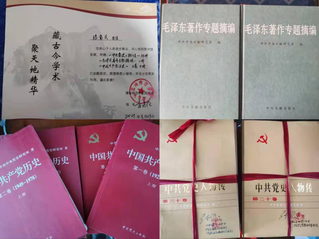 近日,我校党史学习教育全面启动,张觉民听闻后深受鼓舞,决定将自己从1984年至1989年收藏的《中共党史人物传》(35本)及《毛泽东著作专题摘编》(上、下册)和《中国共产党历史》(两卷4本)捐赠给学校图书馆,让更多青年学生了解中国共产党的历史和中国共产党杰出代表的革命历程。
