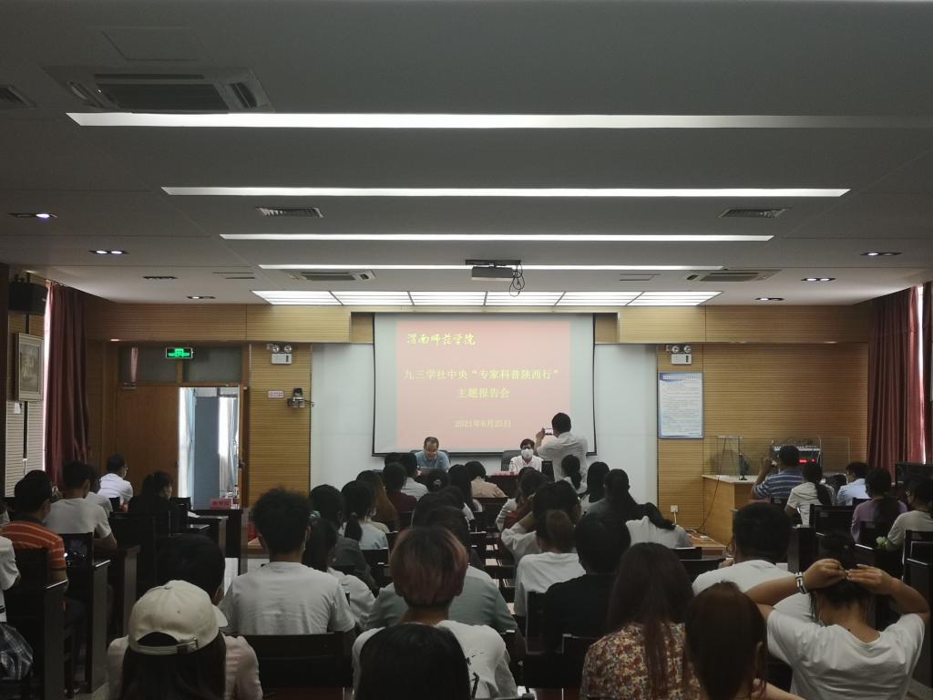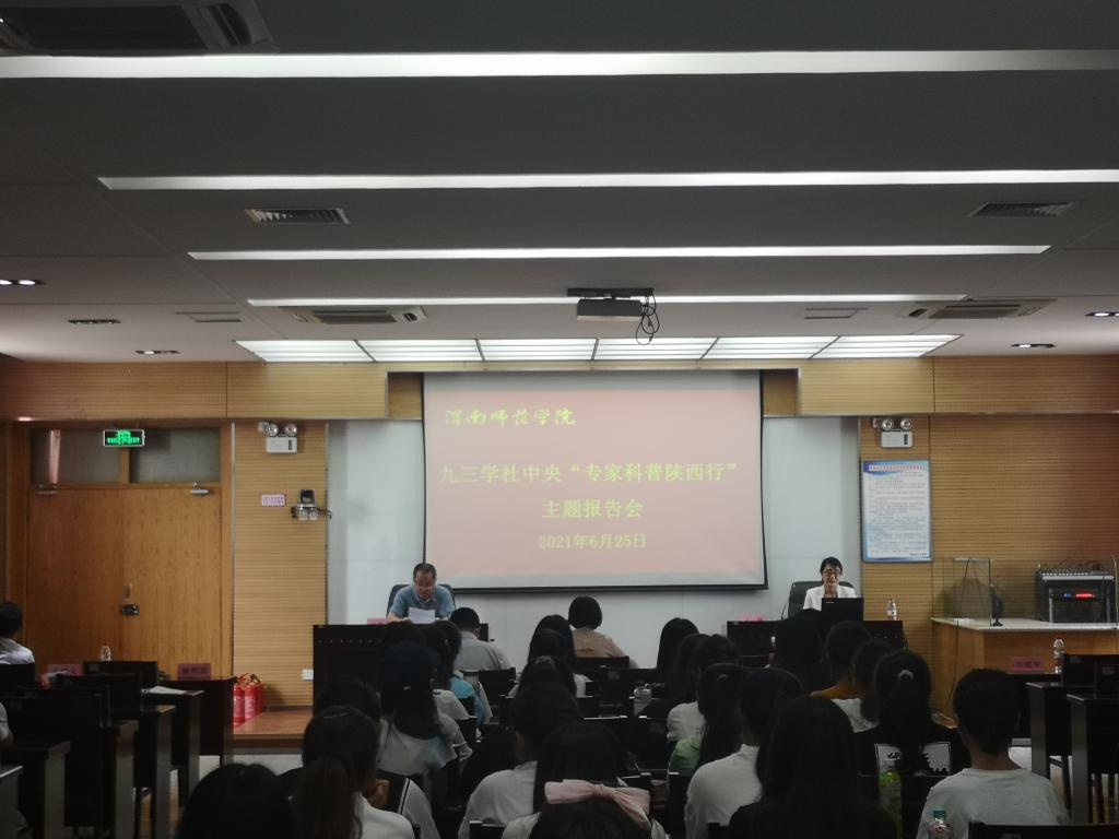 九三学社陕西省委社会服务部部长张雅宁、副部长丁鹏飞,九三学社渭南市委会专职副主委王建军,九三学社渭南市委会社会服务委员会主委陈锋,九三学社欧宝娱乐官方app支社主委乔明文出席报告会。九三学社渭南市委会成员代表,我校统战部全体人员、九三学社欧宝娱乐官方app支社代表,以及环境与生命科学学院、外国语学院的师生代表等200余人聆听报告。(通讯员 宋威 审核人 杨利民)