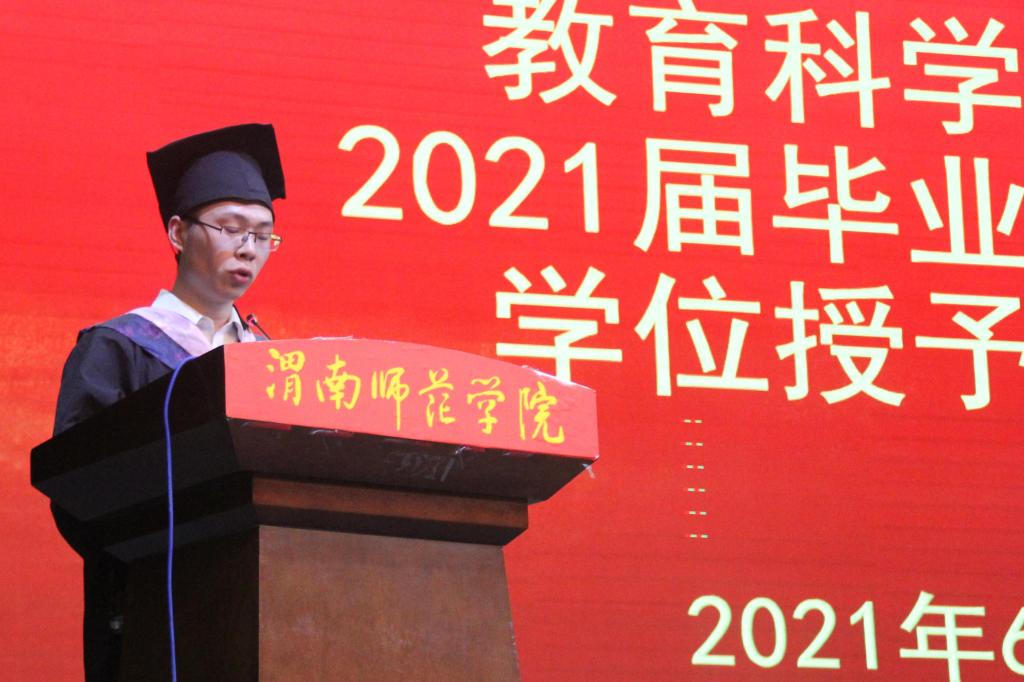 毕业生代表梁峰同学向辛勤培育的母校、向殷切教导的老师和支持帮助的同学、家人表示衷心的感谢。他说,面对未来,会坚定信心,做肩负使命、追求卓越的渭师人;在校生代表舒梦鑫同学对学长学姐们的关心与帮助表示感谢,并祝愿学长学姐们以毕业为起点,乘风破浪、不忘初心、活出自己的恣意人生。