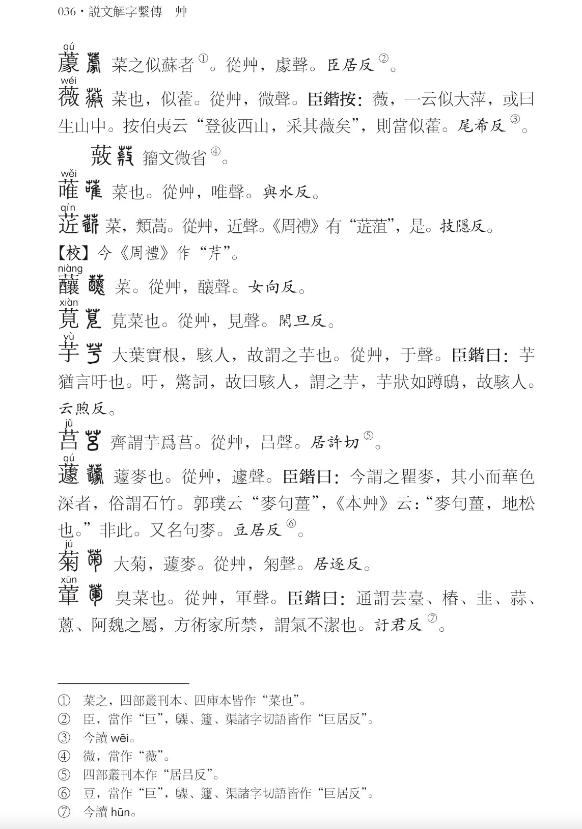 《系传》在装帧上较“大徐本”有很大改进,1200多页的书精装一册就是为了读者查检方便;再看内文,部首字加了灰底,点校者校记用脚注呈现,篆文前加楷书字头和注音,不同内容采用不同的字体等等,这些都是责编老师精心策划的。另外,书末附有《部首字检字表》《音序检字表》《笔画检字表》三套索引,也为方便读者使用考虑的。