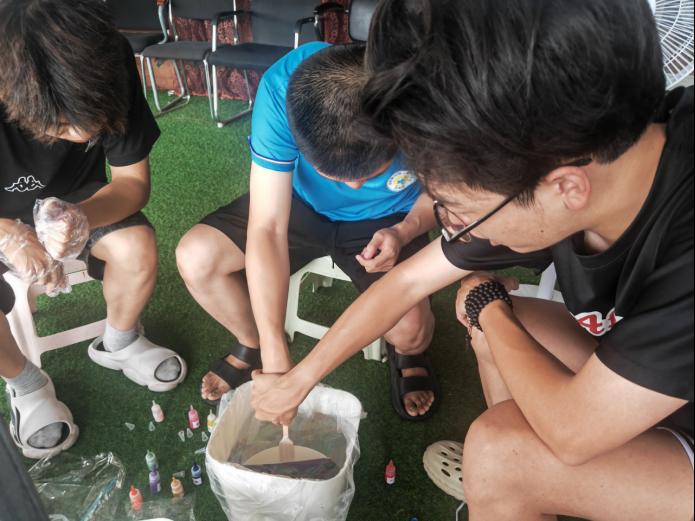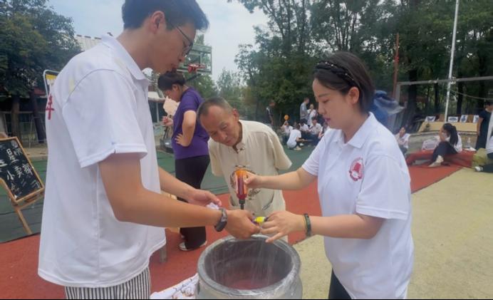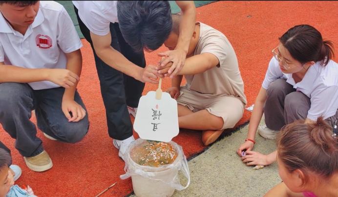 活动现场,实践团成员化身“非遗讲师”,耐心讲解各类非遗技艺的历史渊源与制作技巧。从漆扇上细腻的线条勾勒,到青花瓷贴画中形状的搭配,从葫芦表面独特的纹样设计,到扎染布料上变幻的蓝白花纹,每一项技艺都让孩子们沉浸其中。大家在实践团成员的一对一指导下,亲手尝试创作,用指尖的温度赋予非遗作品新的生命力。