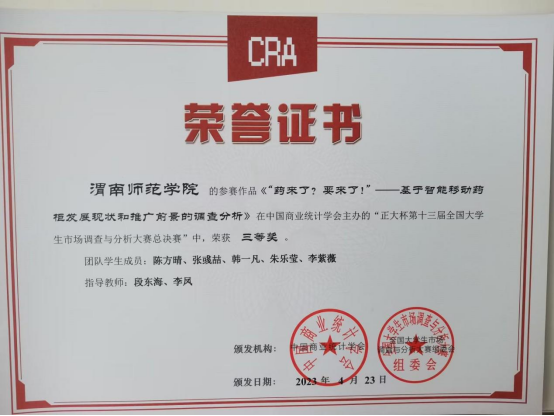 至此,数学与统计学院学生在第十三届全国大学市场调查与分析大赛中,共获得本科组国家二等奖1项、国家三等奖3项、陕西省一等奖4项、陕西省二等奖3项,创该院此项赛事获奖数量及质量新高。