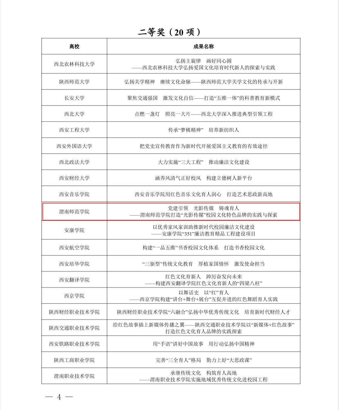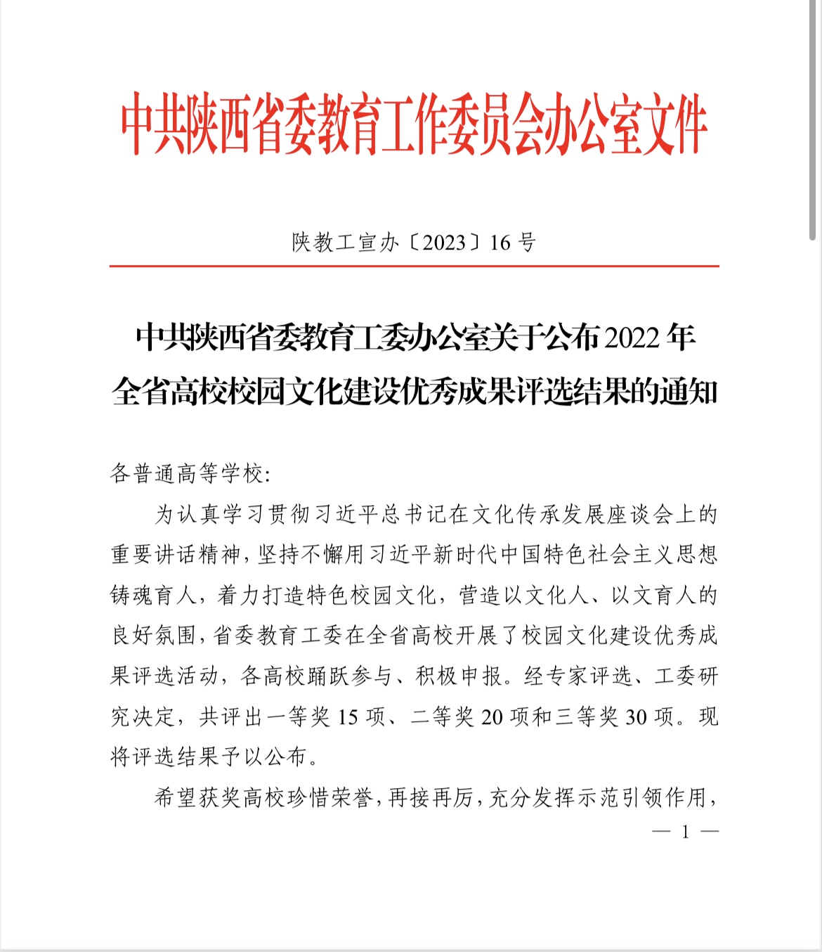 近日,中共陕西省委教育工委发文通报表彰2022年全省高校校园文化建设优秀成果奖,经学校宣传部评选推荐、传媒学院申报的《党建引领 光影传媒 铸魂育人——欧宝娱乐官方app打造“光影传媒”校园文化特色品牌的实践与探索》成果荣获二等奖。