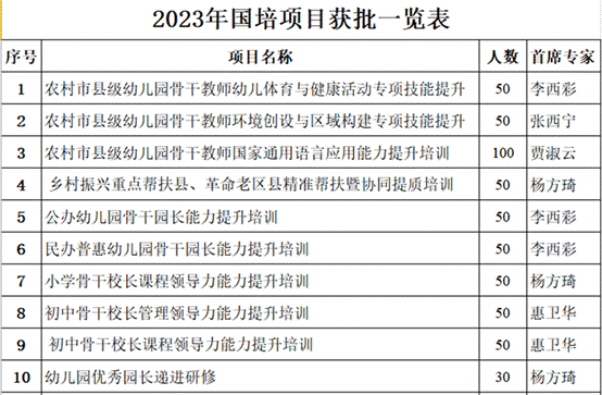 近日,陕西省教育厅发布了《关于做好2023年“国培计划”—陕西省中西部骨干项目的通知》(陕教师办〔2023〕33号),我校获批10个项目,培训人数530人,经费281万元。