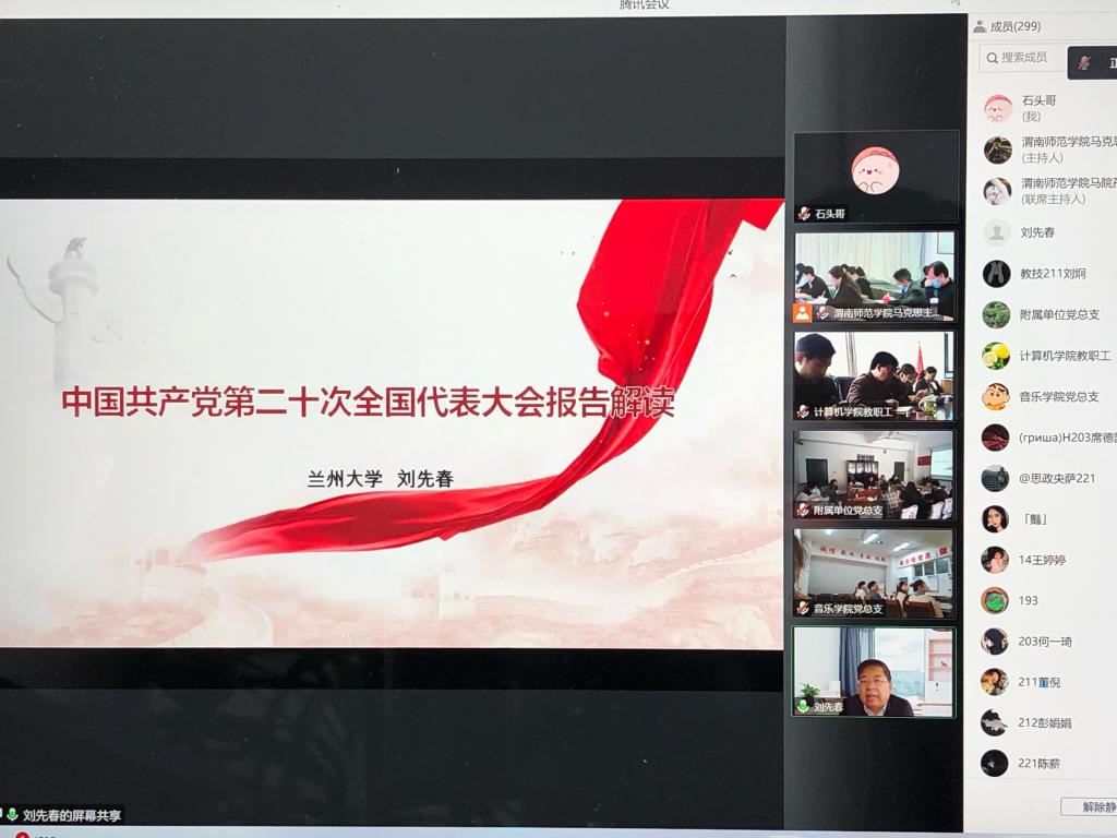 党的二十大,高举旗帜、凝聚力量、团结奋进,具有重大的政治意义、历史意义、时代意义。为进一步加深我校党员干部和广大师生对党的二十大精神的认识和理解,加大对党的二十大报告的广泛宣传和全面解读,在线上分享相关的专家辅导课件基础上,10月26日下午,我校特别邀请兰州大学马克思主义学院刘先春教授作专题辅导报告。