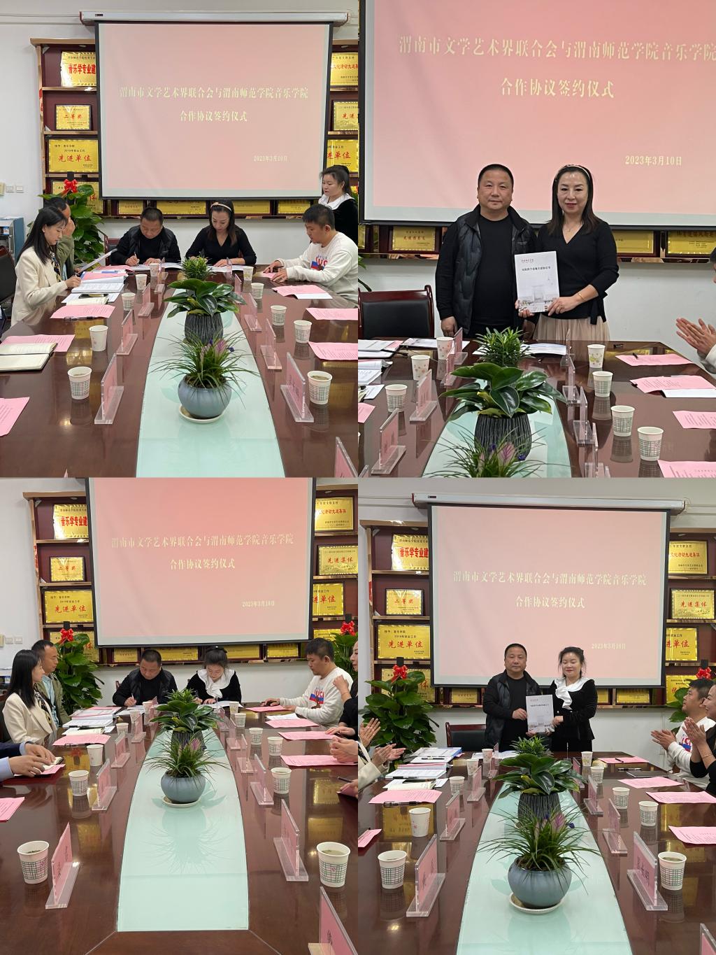 3月10日上午,音乐学院与渭南市文学艺术界联合会举行合作签约仪式。渭南市文学艺术界联合会主席张力、渭南市文学艺术界联合会副主席葛长明,欧宝娱乐官方app音乐学院院长刘鹏、副院长逯克刚以及渭南市音协、舞协和师生代表参加此了次活动。