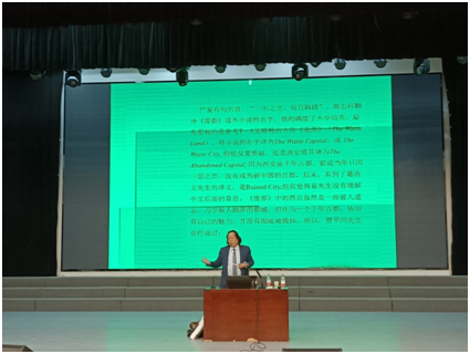 胡教授从近代中国外语学习史入手,指出外语学习的重要性,列举了当今社会大众传媒存在的大量的汉语误用、滥用现象,从汉译外作品适切性视角分析了目前市面上汉译外作品质量良莠不齐的现象,提出保护及弘扬汉语的必要性。胡教授以陕西方言和陕西文学为例,通过所选取的大量例子,向师生们展示了中华文化的厚重与魅力。他指出,汉语是我们先辈留下的宝贵文化遗产,是几千年历史沉淀下的艺术瑰宝,是我们传承和发扬中华文化的最佳载体,如何传承、发扬和传播好汉语更是“互联网”时代需要共同应对的时代课题。最后,胡教授论述了中华之“礼” 的核心价值,强调 “礼”为个人人生之要义,更为社会文明进步之精神力量,守礼明德是推动社会发展的最大动力。