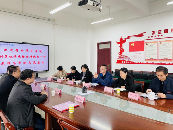 会上,双方分别介绍了各自学院的发展历程、学科专业设置、师资队伍、高层次人才与实验室建设、科学研究等情况。双方围绕学科专业建设与管理、教学科研工作、人才培养、学科竞赛、研究生调剂等方面进行了深入学习与交流。王刚指出,两院都是工科学院,发展思路和人才培养目标相近,相互学习、加强合作非常重要,此次来访更是为信息学院人才培养提供了新的思路。深化了双方在人才培养、师资交流互访、开展招生就业及有组织科研模式建设等领域的交流合作,相信是进一步推动学院高质量发展的基础。杨方琦表示,希望通过此次的座谈交流,建立并加深合作关系,彼此交流借鉴学院建设经验,增进两校合作,进一步推动学院建设。