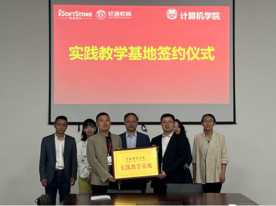 随后,计算机学院分别与西安软通动力网络技术有限公司和西安爱克斯未来文化科技有限公司签订了《大学生就业基地协议》《实践教学基地协议》,凌朝栋为企业授大学生就业基地牌和实践教学基地牌。