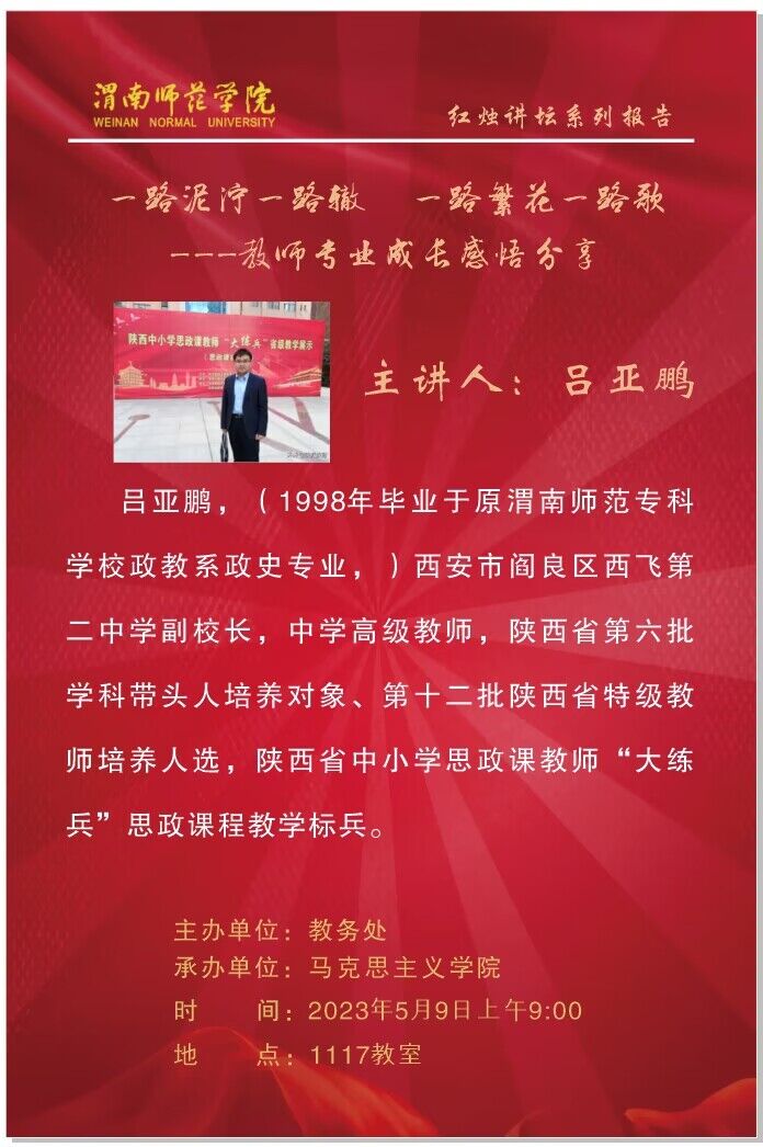 5月9日是欧宝娱乐官方app成立63周年的校庆日,马克思主义学院邀请思想政治教育专业的优秀校友、西安市阎良区西飞二中正高级教师、陕西省首届中小学“思政课”教师大练兵教学标兵吕亚鹏作了题为《一路泥泞一路辙 一路繁花一路歌》的专题报告。思政专业负责人曹立新等教师与2021级百余名学生参加。报告会由副院长单剑峰主持。
