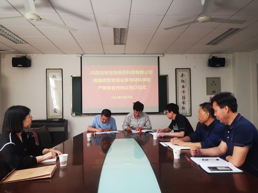 5月15日下午,化学与材料学院与陕西友帮生物医药科技有限公司举行产学研合作协议签订仪式。学院党委书记韩城忠、院长焦更生、副书记任晓婷、副院长刘展晴、副院长王冬华,陕西友帮生物医药科技有限公司行政总经理郭飞、技术总监王振、人事部长蒙明珠共同参加了本次签订仪式。