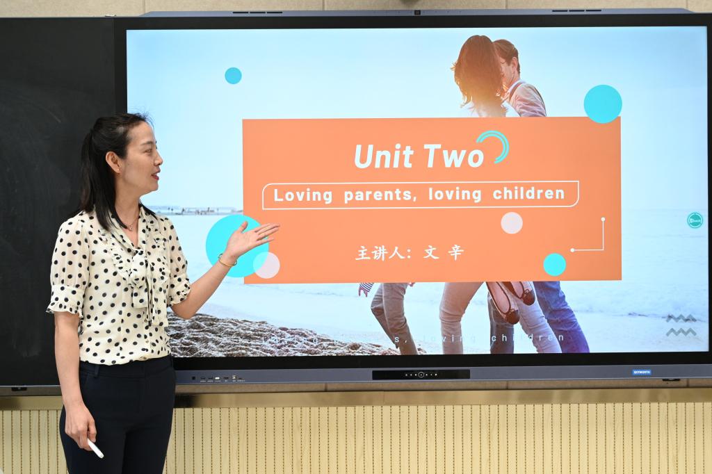本次公开课由校级《大学英语》课程思政示范课负责人文辛副教授主讲。在展示环节,文辛老师紧扣教学内容,聚焦“亲情”相关话题,探讨父母对孩子的关怀与期待,孩子对父母的依恋与敬爱。教学以思政视角全新切入,从我国经典文学作品中父子关系的界定、亲情描述、中国传统孝文化等方面入手,围绕Unit theme, Lead-in, Text study,Unit project and Assignments 等教学内容,引导学生探讨新时代孝文化的内涵。整个教学安排合理、方法得当、趣味性强,不但锻炼了学生语言应用能力,提升了文化素养,帮助学生树立了正确的亲情观与家庭观,实现语言教学与铸魂育人有机融合。