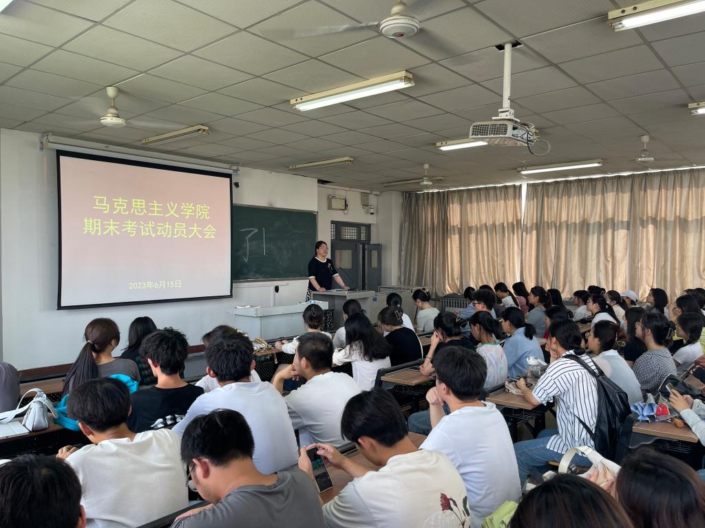6月15日下午,马克思主义学院党政党政负责人包联各年级,分别在1101、1401、1601教室召开期末考试动员会,其中,党总支书记赵国峰包联2022级学生、院长张萍包联2021级、副院长单剑峰包联2020级学生,辅导员和班主任参加。