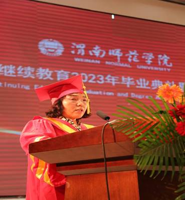 王菊霞致辞,她代表学校向圆满完成学业的毕业生致以热烈的祝贺,向为毕业生成长成才辛劳付出的老师和家属们表示衷心感谢和崇高敬意。在毕业生即将踏上新征程之际,她对大家提出三点希望:一是养成终身学习的习惯;二是永葆“敢于担当,勇于创新”的责任心;三是在人生的新起点上,践行渭师“天天奋斗,天天快乐”的学校精神。