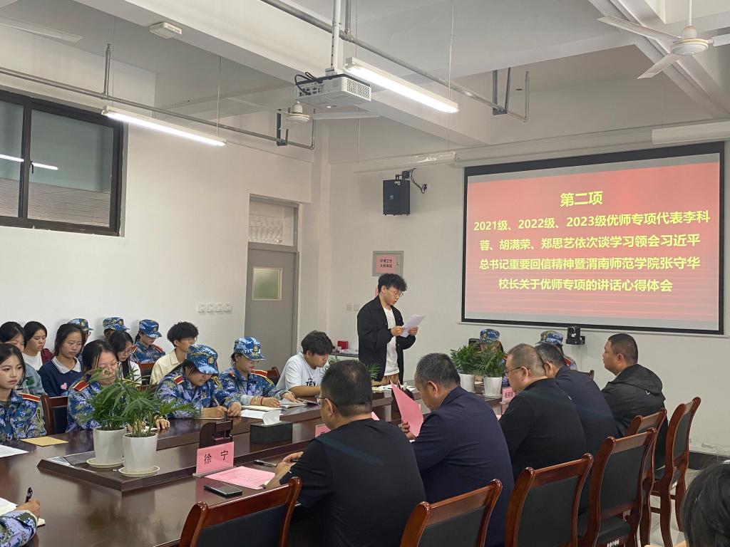 石海彬领学了习近平总书记给北京师范大学“优师计划”师范生重要回信精神和欧宝娱乐官方app张守华校长关于优师专项的相关讲话。部分学生结合实际畅谈了自身的学习感悟和体会。与会同学纷纷汇报了各自学习及生活情况,表达了毕业后到定向地区中小学服务的意愿和决心,并对课程设置及学习、生活中关心的问题提出了意见建议。