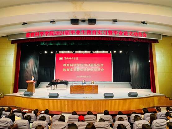 为了扎实做好2024届毕业生实习和论文撰写工作,进一步促进学生对所学知识和技能进行实践运用、总结和深化,引导学生明确认识实习的目的和意义,尽快开展毕业论文相关工作,9月20日下午,教育科学学院在演艺厅召开2024届毕业生教育实习暨毕业论文动员会。党总支书记李武军,院长李西彩、专业负责人、专任教师、毕业班辅导员以及部分2024届毕业生参加本次会议。会议由党总支副书记马雷蕾主持。