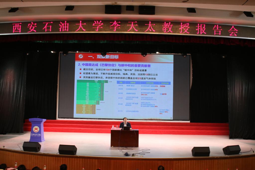 11月1日下午,原西安石油大学校长、党委副书记李天太教授应邀到我校以《双碳新目标下油气与新能源发展趋势及展望》为主题作专题报告,报告会由副校长常青林主持。学科办主任袁梁、化学与材料学院副科级以上干部、教师代表、学生代表等300余人聆听报告。