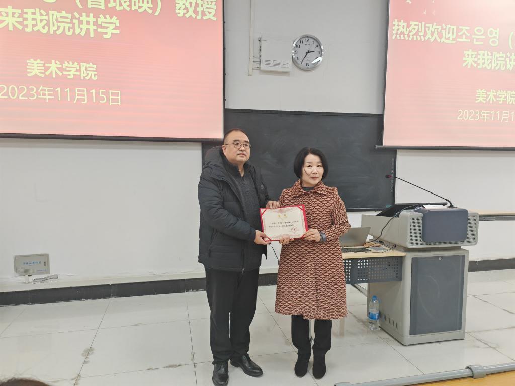 殷晓克为曺垠暎教授颁发了欧宝娱乐官方app美术学院客座教授(外籍专家)的聘书。