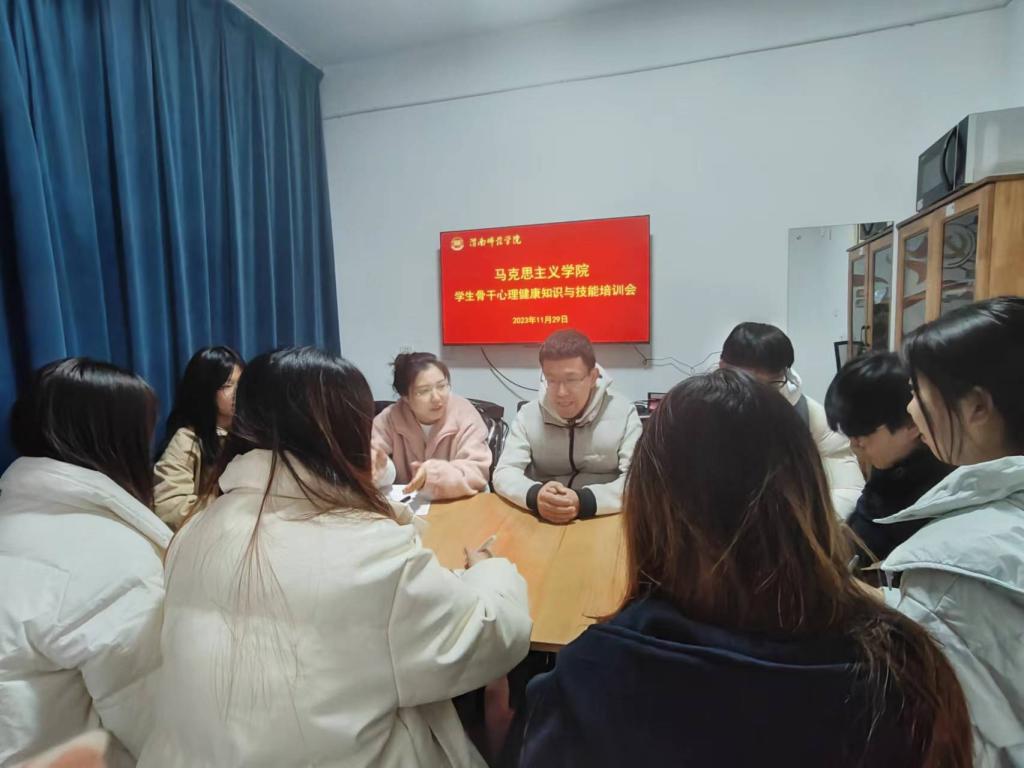 11月29日上午,马克思主义学院在学生社区党支部党团活动室召开学生骨干心理健康知识与技能培训会,学院团委负责人、心理专干关帅老师,辅导员陈晨以及2022级、2023级全体心理委员参加了此次培训会。