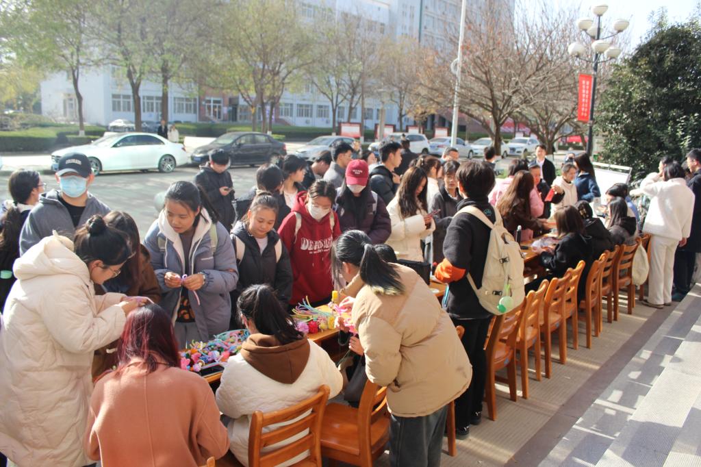 手工制作绒花和泥塑同时开展。五彩缤纷的手工绒花和栩栩如生的泥塑吸引了同学们的目光,他们或领走自己喜欢的作品或参与其中,制作属于自己的作品。