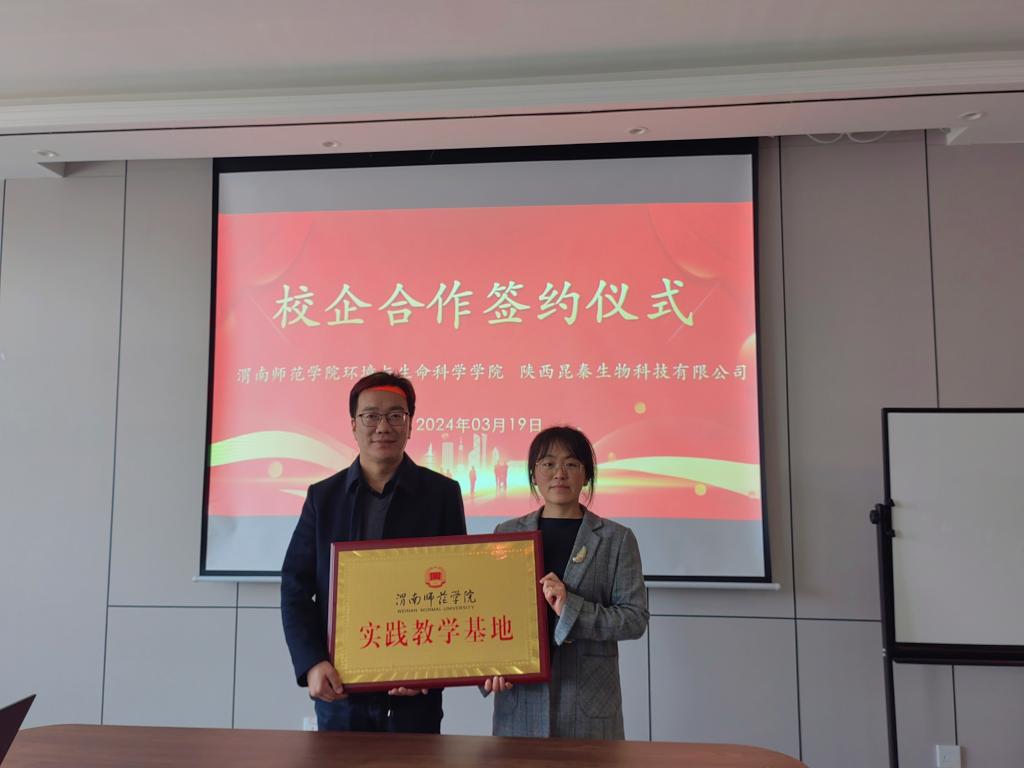 刘龙飞代表环境与生命科学学院与陕西昆秦生物科技公司签订大学生就业基地协议,蒋缠文与陕西昆秦生物科技公司签订教学实践基地协议。
