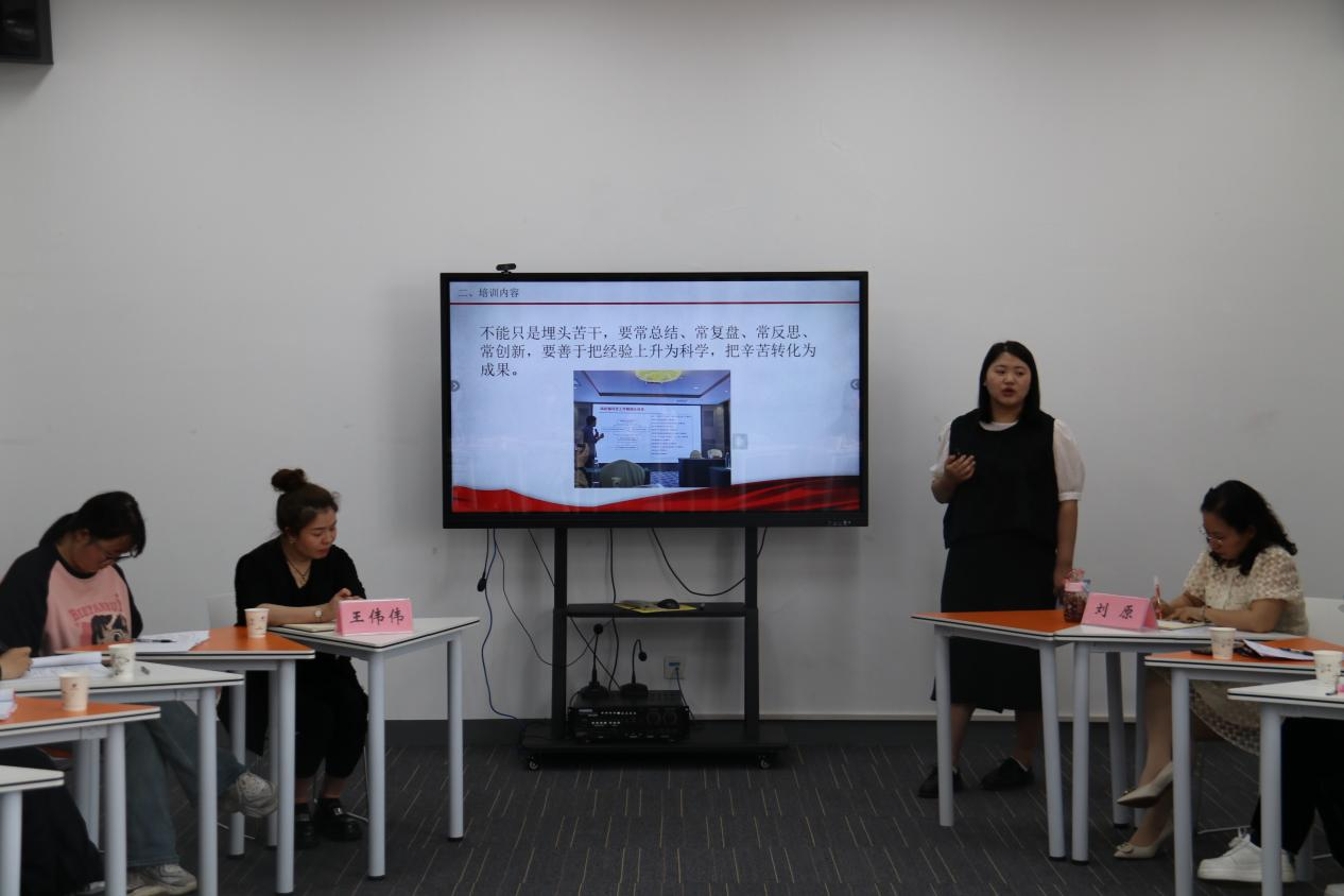 交流分享环节,环境与生命科学学院学工办主任王慧和化材学院学工办主任雷岩分别分享了参加此次“2024年高校思政工作队伍精准思政能力提升高级研修班”的所见所闻和学习收获。首先由王慧为大家介绍了此次培训的课程设置和主要内容,并分享了学习收获。她表示:“作为学工队伍一员,要想把工作做出色,做出成绩,在做好基础业务工作的同时,要主动结合自身特点,努力培育兴趣特长,在心理育人、资助育人等专项方面深耕细作,有效提升育人时效的同时,也为个人职业生涯发展积蓄能量。”