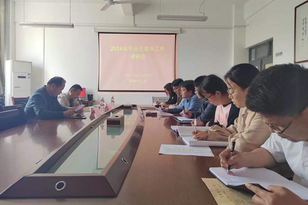 5月6日下午,党委副书记汪勇、学工部副部长马耀斌深入物理与电气工程学院调研指导2024届毕业生就业工作,学院党政班子、专业负责人、毕业班辅导员参加调研座谈会。