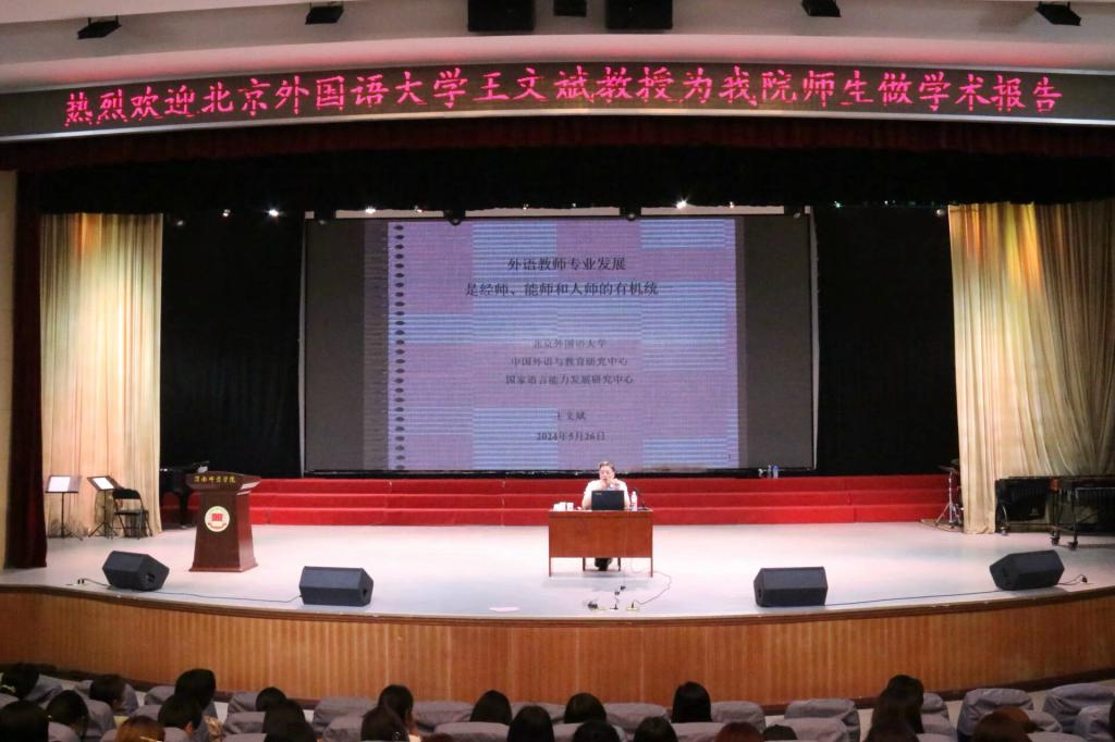 5月26日下午,北京外国语大学王文斌教授应邀为外国语学院师生作题为“外语教师专业发展是经师、能师和人师的有机统一”的学术报告。校党委委员、副校长曹强、学院领导班子成员及学院300余名师生参加了本次报告会。报告会由外国语学院院长李海荣主持。