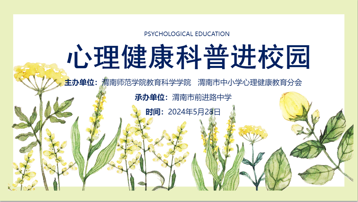 5月28日,教育科学学院与渭南市中小学心理健康教育分会联合举行心理健康科普进校园活动。本次活动由教育科学学院院长李西彩带队,带领心理学221班、231班学生前往渭南市前进路中学进行科普活动。渭南市教育学会会长任兆文、前进路中心校长程红艳、副校长田森、渭南市青少年心理健康教育分会副会长、教育科学学院副院长马雅菊和刘峰、渭南市青少年心理健康教育分会副会长高小云及学会部分理事参加了本次活动。