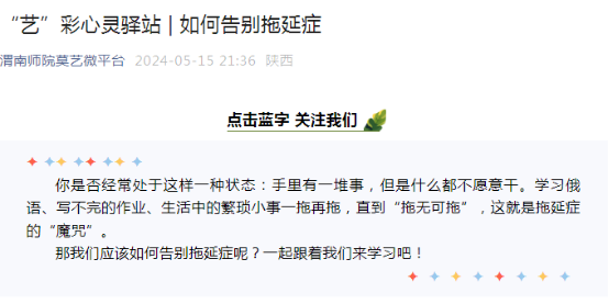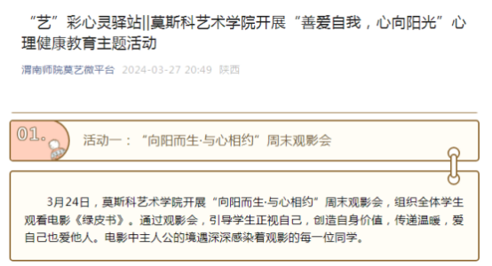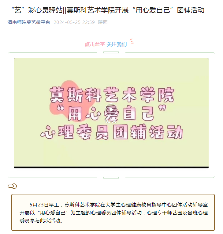 “艺”彩心灵驿站栏目是莫斯科艺术学院的特色心理健康科普专栏,以普及心理健康知识与理念为宗旨,主要以短视频模式宣传心理健康的重要性以及缓解心理压力的途径,帮助同学们解决日常学习与生活的心理困扰,提升抗压抗挫能力。本学期目前已推出一期关于“”心理健康科普视频。