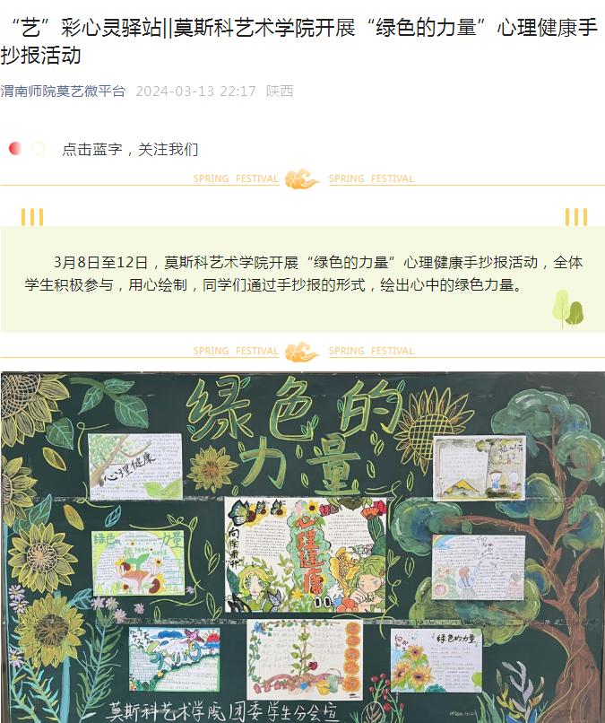 3月8日至12日,莫斯科艺术学院开展“绿色的力量”心理健康手抄报活动,全体学生积极参与,用心绘制,同学们通过手抄报的形式,绘出心中的绿色力量。此次活动通过提高认识、加强自我心理疏导、积极寻求帮助的方式,促进学生心理健康和素质全面发展。