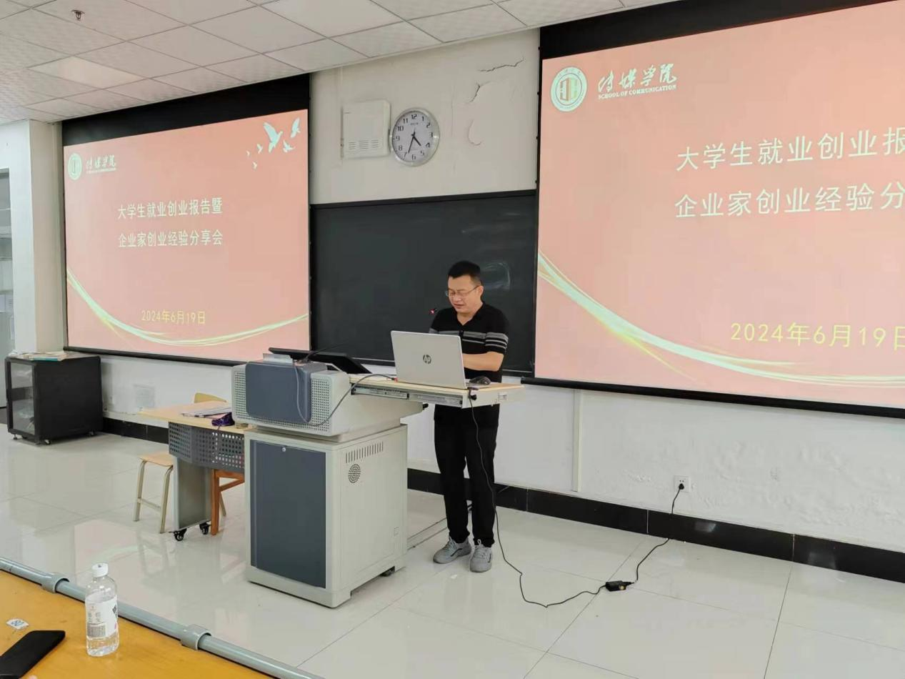 6月19日,传媒学院召开大学生就业创业报告暨企业家创业经验分享会。党总支书记田康顺、院长曹熙斌、副院长侯君奕,相关指导教师及2021级全体学生参会。分享会由院长曹熙斌主持。