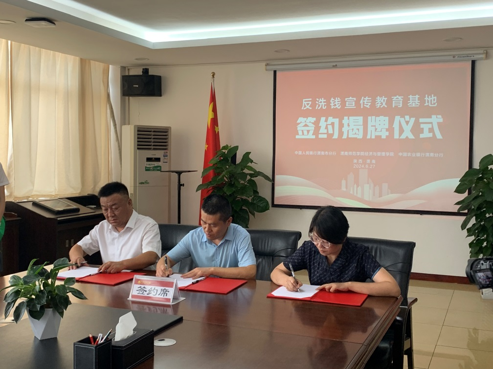 6月27日,经济与管理学院与中国人民银行渭南市分行、中国农业银行渭南分行举行2024年反洗钱宣传教育基地挂牌仪式。学校党委副书记、纪委书记、监察专员肖耀刚,中国人民银行渭南市分行党委委员、副行长郭文峰,中国农业银行渭南分行党委副书记、副行长寸亚文等相关领导出席,会议由经济与管理学院党总支书记李富荣主持。