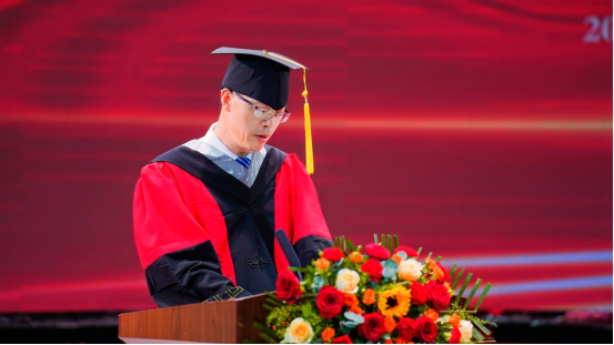 苟鹏军发表了热情洋溢的致辞,代表学校向全体毕业生致以热烈祝贺和美好祝福,并回顾了同学们的求学征程,同时向毕业生提出三点期望:第一,脚踏实地,追求卓越。第二,热爱生活,宽容自信。第三,甘于奉献,勇于担当。