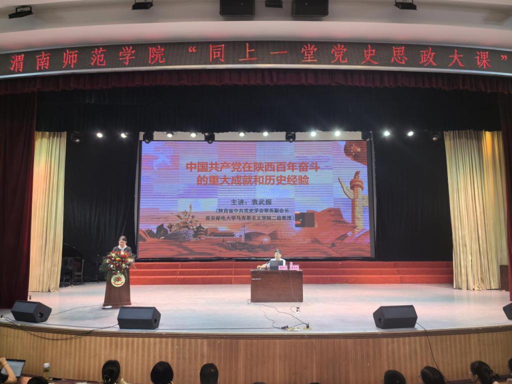 7月1日下午,全国优秀社会科学普及专家、陕西省宣传思想文化系统“六个一批”人才、西安邮电大学党史与红色文化研究院院长袁武振教授受邀来校,在演艺厅为我校师生上《中国共产党在陕西百年奋斗的重大成就和历史经验》的党史思政大课。马克思主义学院全体教师、中国共产党历史专业全体学生、其他专业学生代表300余人参加报告会。会议由马克思主义学院院长张萍主持。