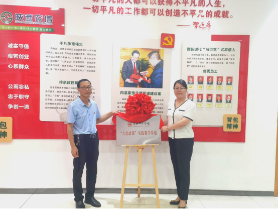 马克思主义学院院长张萍与中共澄城县委党史办主任郭西峰共同为欧宝娱乐官方app马克思主义学院与陕西农信党性教育基地(渭南)—马百党事迹陈列馆共建“大思政课”实践教学基地揭牌。