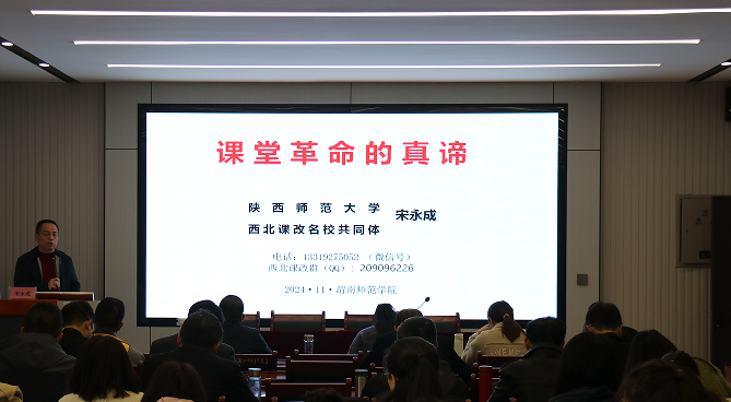 本次新课改示范教学活动由特邀专家陕西师范大学宋永成博士主讲,全体国培学员参加,2023级历史学优师班全体学生观摩并参与本次活动。宋永成教授以《世界现代史》教材中《希特勒上台》一课为例,带领国培班的学员上了一节小组合作学习的体验课。宋永成教授把所有学员分为7个小组,并提前给每个小组布置了学习内容。课堂上,国培班学员以小组为单位,依次展示学习内容。每个小组展示完毕后,其余小组提问质疑,全班进行讨论。通过亲身参与的实践过程,这些来自一线的中学历史教师初步领会了如何把小组合作学习运用于中学历史课堂教学,以及小组合作学习在中学课改中的价值和意义。学员们积极展示,踊跃讨论,学习热情很高,课堂气氛活跃。