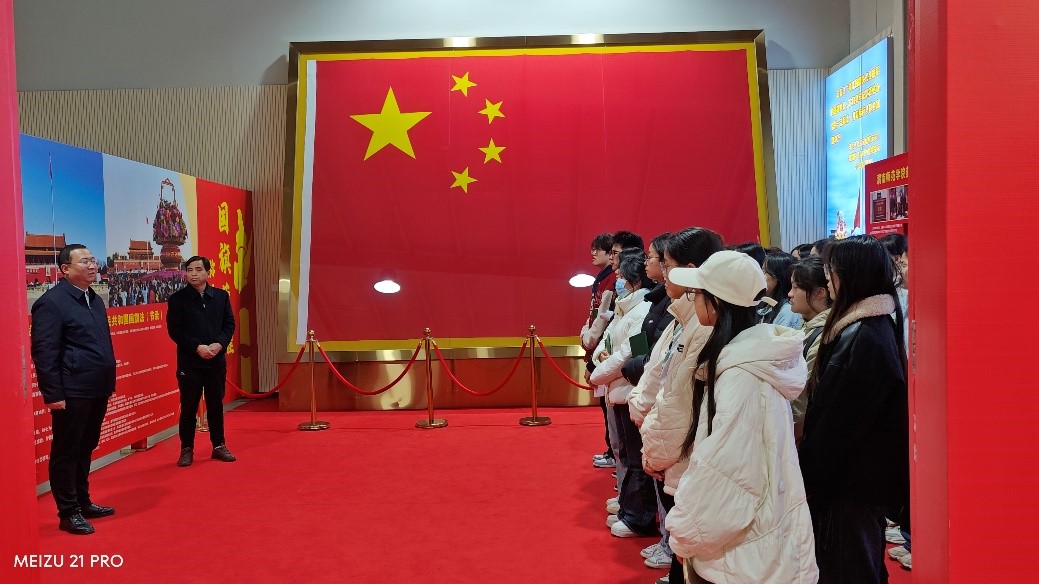 在展馆内,校团委书记赵琦讲到,这面国旗是2023年5月9日欧宝娱乐官方app建校63周年校庆日在北京天安门广场升起的五星红旗,具有唯一性,并从国旗的含义、尺度规格、天安门升旗仪式、国旗法、特别的国旗角及国旗护卫队的组建等几个方面进行了详细解说。国旗展馆庄严大气,集图片、文字、视频、实物等多种展示手段于一体,生动立体地演绎着国旗在历史脉络上的伟大瞬间,使大家置身于重要历史时刻,深刻认识到国旗所代表的国家荣耀和自豪感。