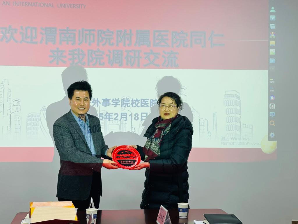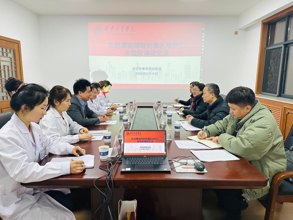 2月18日上午,附属医院党支部书记王雅蓉、院长段楚雷、副院长王新英、办公室主任王鹏一行4人赴西安外事学院校医院交流调研。此次调研旨在借鉴西安外事学院在医院运营发展、校园公共卫生和传染病防控、大学生医保管理及产学研结合等方面的先进经验,为办好学校2025年十大民生实事,推动我校附属医院高质量发展,奠定良好基础。