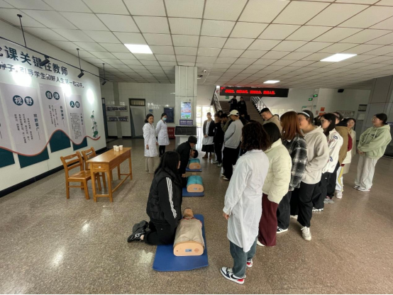 演练现场,在附属医院医护人员的指导下,师生们相互配合,组队练习。医护人员通过“手把手”互动式指导,帮助现场师生将理论知识转化为实际操作技能。大家热情高涨,踊跃实践,借助反复的动手操作加深理解记忆,将急救知识与技能入脑入心。