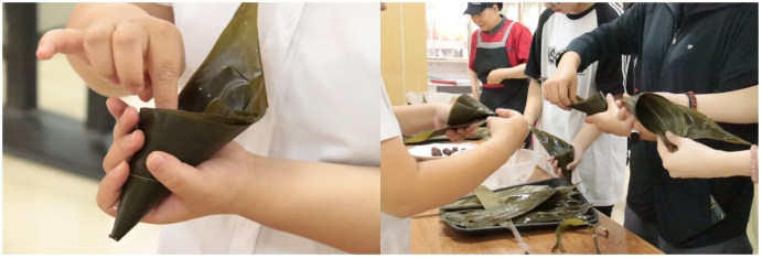 活动现场,气氛热烈非凡。学校后勤服务中心人员精心准备了糯米、粽叶、红枣、豆沙等丰富食材,整齐地摆放在操作台上。师生与后勤人员围在一起,选粽叶、填糯米、加内馅、绕丝线,每一个步骤都充满了挑战与乐趣。尽管许多同学都是第一次尝试包粽子,手法略显生疏,但大家相互学习、彼此帮助。很快,形态各异的粽子便摆满了桌面,有的三角形,还有的正方形,很多形状不太规则,却也别具一番风味。学生通过亲手体验包粽子,从充满创意的粽子,为活动增添了别样的趣味,感受传统美食制作乐趣。