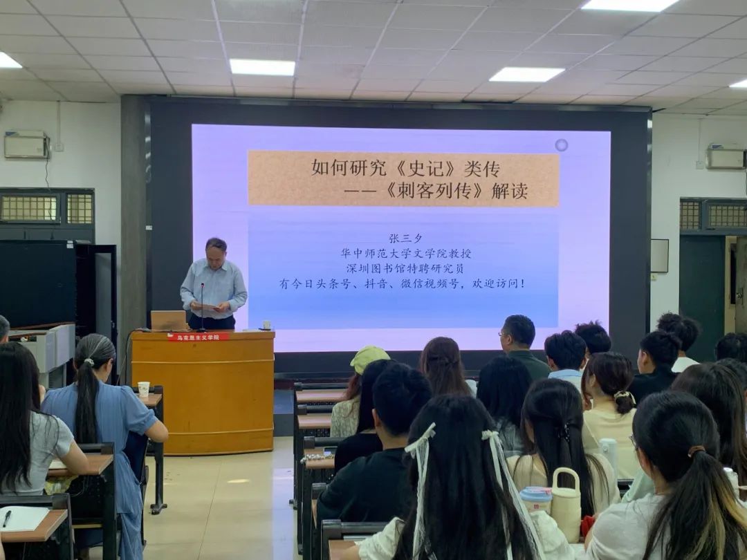 6月6日上午,人文学院特邀著名古典文献学家,教授,博士生导师,中国历史文献学会理事张三夕,在博识楼1101教室为2023级汉语言文学专业近100名学生带来了一场题为“如何研究《史记》类传——《刺客列传》解读”的专题讲座。讲座由学院凌朝栋教授主持。