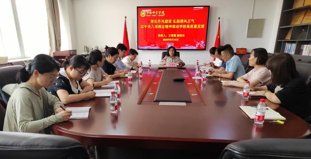 王菊霞以《深化作风建设 弘扬清风正气——以中央八项规定精神推动学校高质量发展》为题,围绕中央八项规定精神的核心内涵与重要意义、高校领域普遍存在的突出问题与风险点剖析以及践行中央八项规定精神的具体要求等三个方面进行了详细的解读和阐释,和大家深入交流了自己的认识和体会。王菊霞指出,学院要树牢看齐意识,坚持以上率下,以强化职能监管、压实责任链条、加强监督检查为抓手,以优良作风凝聚奋进力量,助力学院高质量发展。