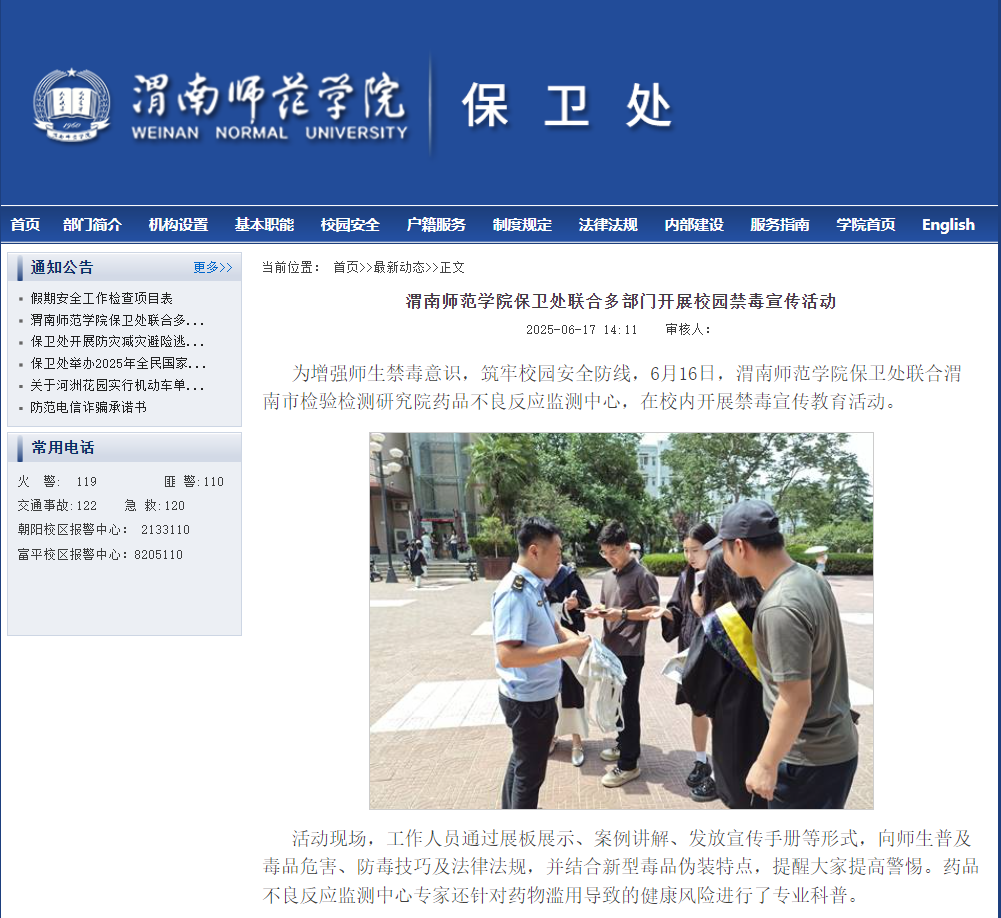 加强与渭南市国家安全局、内保大队、交警大队、临渭分局站南派出所、富平县东华派出所的沟通协调,积极开展国家安全、反电诈、禁毒宣传月、安全生产月等各类宣传教育活动。积极开展校园电动车专项治理行动,增划了安全停车区域,启动电动车校园通行标识办理工作。同时进一步加强校园机动车管理,制作悬挂有序停放提示标牌,强化违停处置,有效实施“缓堵保畅”。严格门禁管理,实行进入校园验证制度,陌生人来访登记率达100%,对外来车辆进行开箱检查,把好入口关。开展了实验室安全大检查活动;对朝阳校区大门外的出租车乱停乱放、拉客及商业摊位进行了专项治理;积极开展矛盾纠纷排查和安全隐患排查,组织校内商业网点安全专项检查6次,排除安全隐患30余处。统筹安排,精心组织,实现重点区域化专人盯防,圆满完成四六级英语考试、审核评估、田径运动会等安全保卫工作。