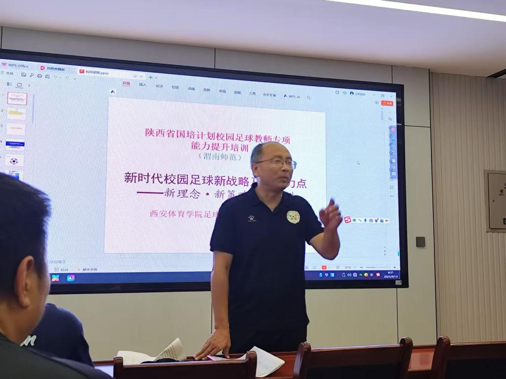 本次培训紧扣校园足球教学与实践需求,围绕“足球竞赛规则与裁判法”“青少年足球训练课程设计”和“校内足球竞赛组织”等专题展开,特邀省内外多位专家授课。西安体育学院席海龙教授解析了“新时代校园足球发展战略”,大连大学冯爱民教授就“足球教学训练核心素养”进行深入讲解,西安市铁一中学程辉老师则系统阐述了青少年足球“启蒙、基础、发展、提高过渡”四个阶段的训练要求。