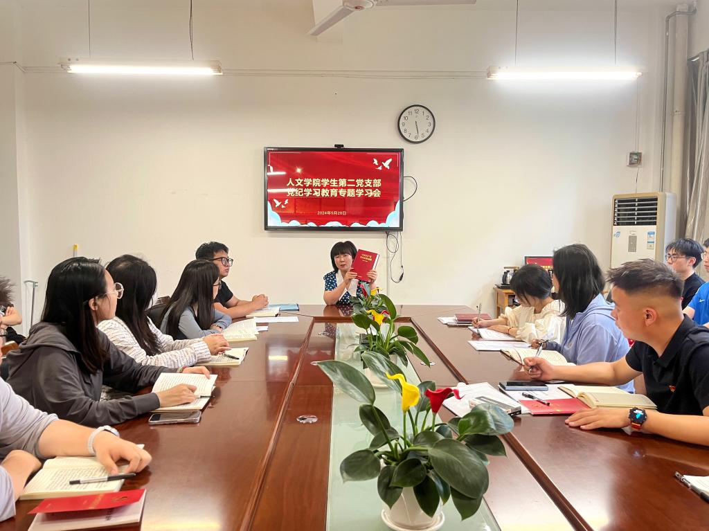 5月20日下午,人文学院学生第二党支部在博识楼1318会议室召开党纪学习教育专题学习会,会议由组织委员杨帆主持,人文学院党总支书记张晶、支部书记孟子祥、宣传委员王乐靖及支部全体学生党员参会。