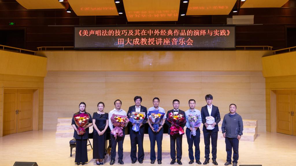 随后的音乐会上,田大成教授倾情献唱13首中外经典声乐作品,音乐学院院长刘鹏、朱长莉、赵朝阳担任艺术指导,田教授以精湛的技艺和深情的诠释征服全场。中国作品《杨白劳》《延安颂》《黄河颂》饱含家国情怀,展现了民族音乐的厚重底蕴;西方经典《我的太阳》《今夜无人入睡》则彰显了美声唱法的辉煌与艺术感染力。