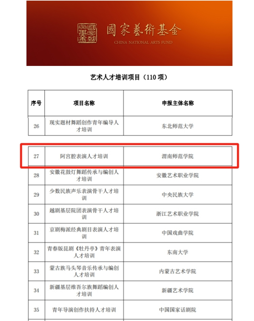 近日,国家艺术基金管理中心发布《国家艺术基金(一般项目)2024年度资助项目名单》。我校音乐学院青年教师陈波申报的《阿宫腔表演人才培训》获批国家艺术基金艺术人才培训项目立项,资助金额120万元。