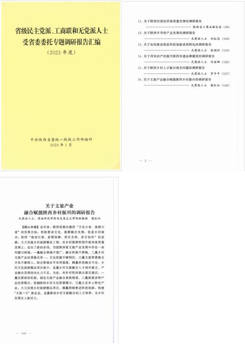日前,为贯彻落实习近平总书记关于做好新时代党的统一战线工作的重要思想,充分发挥无党派人士、党外知识分子的智力优势,助力奋进中国式现代化新征程、谱写陕西高质量发展新篇章,党委统战部深入开展统一战线“凝心铸魂强根基 团结奋进新征程”主题教育,积极组织我校无党派人士、党外知识分子申报2023年度理论问题研究和重点调研课题,我校共有6人参加省委统战部的重点调研课题并提交了调研报告,其中,无党派人士、马克思主义学院副教授梁红仙《关于文旅产业融合赋能陕西乡村振兴的调研报告》入选了陕西省委统战部编印的《省级民主党派、工商联和无党派人士受省委委托专题调研报告汇编(2023年度)》,省委书记赵一德亲笔批示“这些报告是下了功夫的。各相关部门要认真参研。”